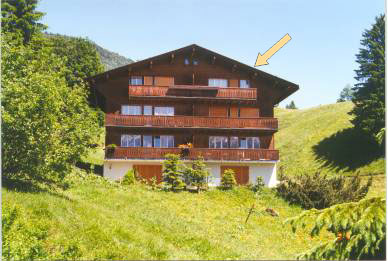 Unsere Ferienwohnung  im Chalet Bergblick befindet sich auf der rechten Seite im obersten Stockwerk mit Balkon nach Süden (siehe Pfeil). Sie liegt auf 1380 m über NN.